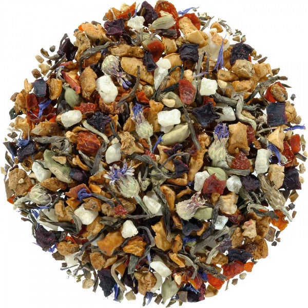 Beschrijving: Prachtige, winterse melange van witte thee en verschillende vruchten en kruiden waaronder appel, ananas, kardemom en kaneel.