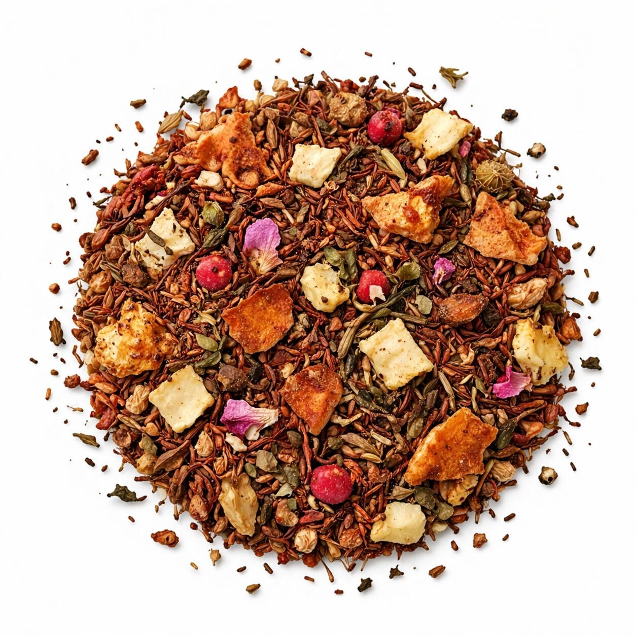 Ingrediënten: appelstukjes, rooibos, basilicum, kaneel, gember, sinaasappelschillen, roze peper, aroma, rozenblaadjes, natuurlijk aroma
