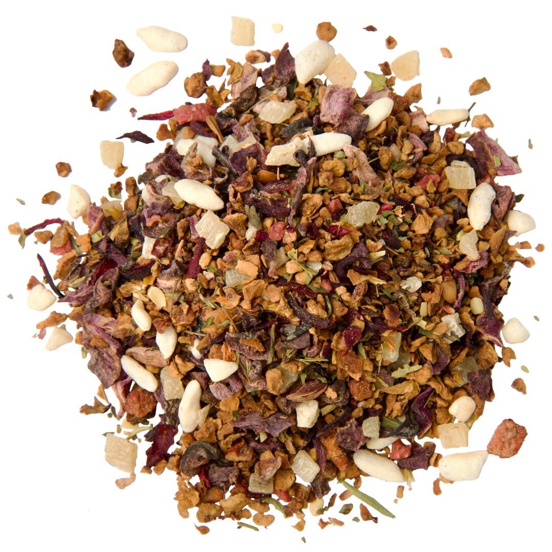 Ingrediënten: Lila wortel, appelstukjes, gekonfijte ananasstukjes (ananas, suiker, zuurregulator: citroenzuur), hibiscus, zoetkruid, gepofte rijst, aroma, aardbeienstukjes, frambozenfruitgranulaat (glucosestroop, suiker, frambozen, verdikkingsmiddel: natriumalginaat), natuurlijk aroma.